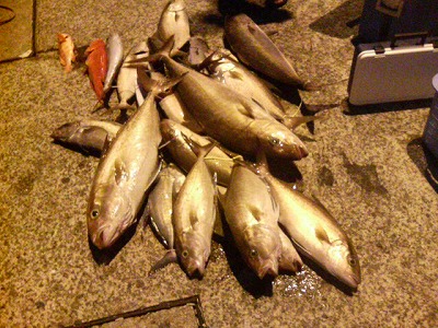 昼間釣っておいた活餌でアオチビキを連続3本。
